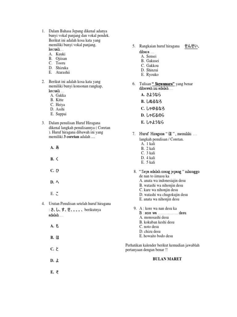 We did not find results for: Maybe you would like to learn more about one of these? Soal bahasa jepang kelas 12 hiragana. Check spelling or type a new query.